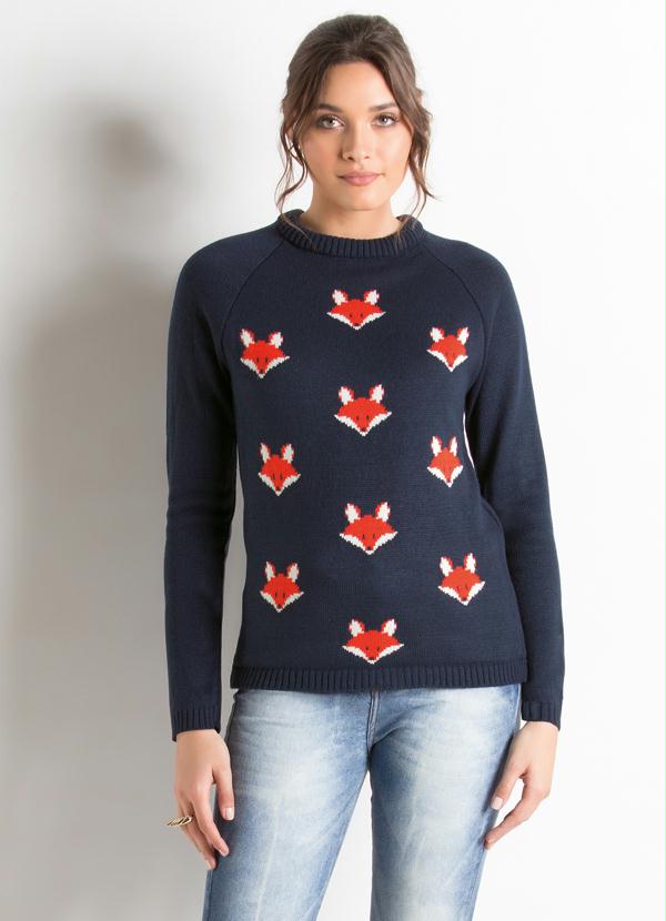 As estampas com bichos fofinhos têm feito sucessos nos looks atuais, saindo das t-shirts para estampar também vestidos, saias, moletons e suéteres. Aqui a estampa de raposa tem uma cor contrastante que ganha bastante destaque com o fundo escuro.