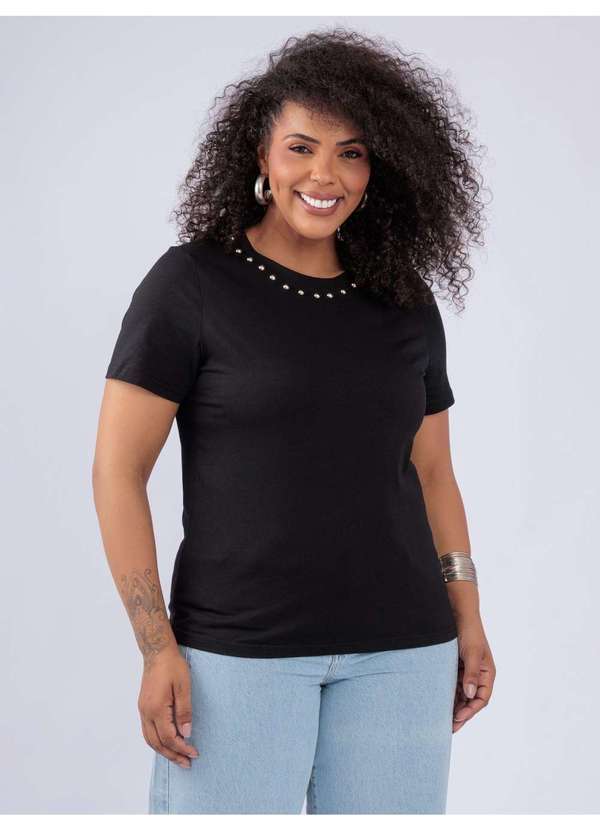 T-Shirt confeccionado em algodão, como detalhes tachas metalicas em torno da gola. Guia de Medidas: 44 ¿ Busto 104cm | Cintura 104cm | Comprimento 64cm 46 ¿ Busto 108cm | Cintura 108cm | Comprimento 65cm 48 ¿ Busto 112cm | Cintura 112cm | Comprimento 66cm Composição: 95% Algodão 5% Elástano