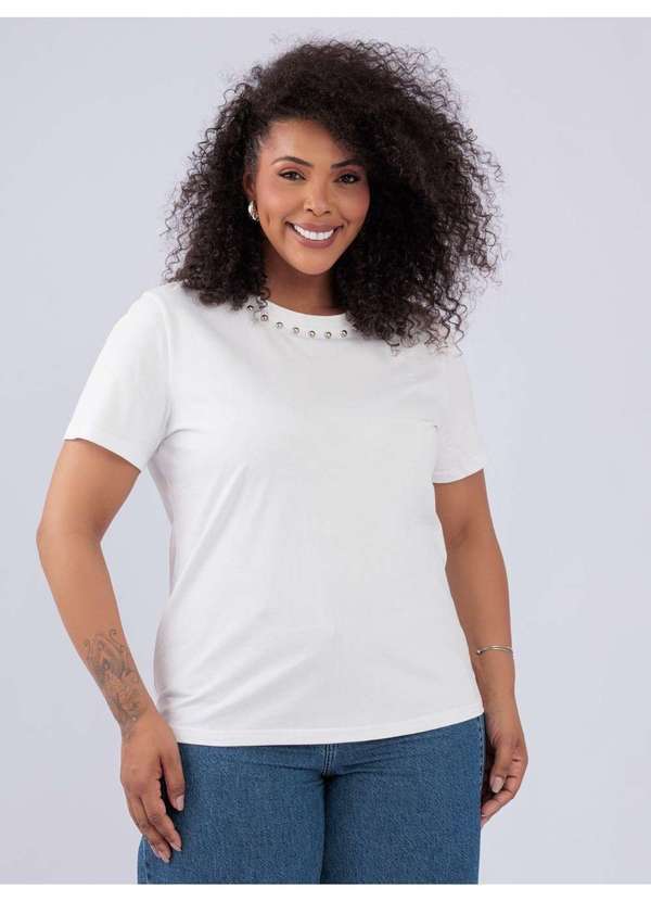T-Shirt confeccionado em algodão, como detalhes tachas metalicas em torno da gola. Guia de Medidas: 44 ¿ Busto 104cm | Cintura 104cm | Comprimento 64cm 46 ¿ Busto 108cm | Cintura 108cm | Comprimento 65cm 48 ¿ Busto 112cm | Cintura 112cm | Comprimento 66cm Composição: 95% Algodão 5% Elástano