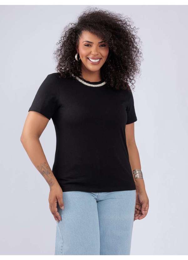 T-Shirt com detalhes em Strass na gola, confeccionado em poliéster e elastáno. Guia de Medidas: 44 ¿ Busto 104cm | Cintura 108cm | Comprimento 63cm 46 ¿ Busto 108cm | Cintura 112cm | Comprimento 65cm 48 ¿ Busto 112cm | Cintura 116cm | Comprimento 68cm Composição: 95% Poliéster 5% Elástano