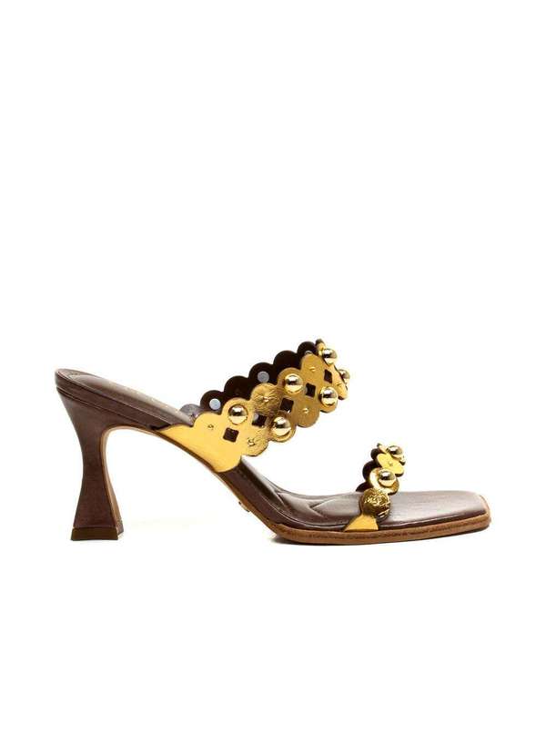 Com um design sofisticado e detalhes marcantes, este tamanco em couro se destaca pelo trabalho artesanal impecável. Suas tiras sobre o pé recebem um refinado corte a laser, criando um efeito de profundidade e leveza. Os adornos de semi-esferas cromadas acrescentam um toque de brilho e modernidade, realçando sua estética exclusiva. O bico quadrado reforça a elegância do modelo, enquanto o salto médio escultural equilibra conforto e sofisticação. Uma peça que traduz inovação e requinte em cada detalhe. Características Material: Couro Metal Bala Cor: Ouro Altura do salto: 7,5cm .