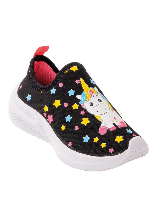 Tênis infantil desenvolvido em tecido com estampa de estrelas e unicórnio. Modelo Calce fácil. Solado em PVC.