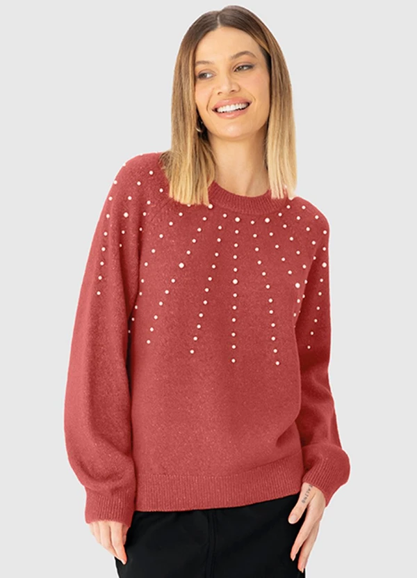 Enfim - Blusão Suéter em Tricô com Pérolas Laranja