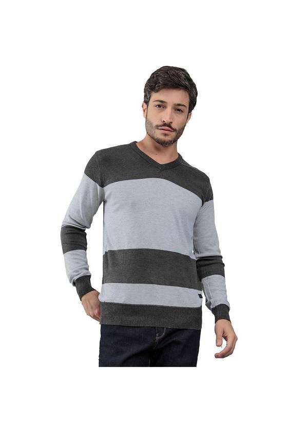 Suéter masculino confeccionado em tricô. Possui gola v, manga longa, acabamento em ribana e costura no tom.
