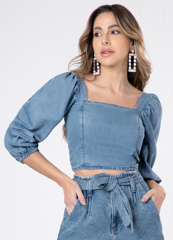 Lunender - Top Cropped Jeans com Mangas Bufantes Jeans