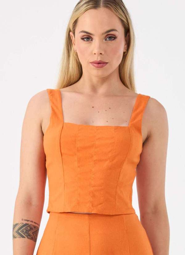 Top cropped confeccionado em tecido plano de linho com viscose, cor laranja, possui elastano em sua composição, proporcionando conforto ao vestir e toque macio, não possui transparência. A peça possui modelagem em alfaiataria, shape reto, decote quadrado, frente com costura de pespontos, forro interno, alças largas, fechamento por zíper na parte de trás e comprimento curto na altura do cós. O cropped de linho é uma variação moderna e casual das peças tradicionais de linho, sendo uma opção versátil para diferentes estilos, ocasiões e estações do ano. É ideal para ser usada com partes de baixo que possuem cintura mais alta, como calças, saias ou bermudas. Experimente combiná-lo com peças de linho da mesma coleção para um look monocromático elegante.