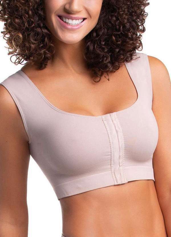 Características: Top Sustentação com Abertura Frontal Sem costura em formato de regata, com as costas fechadas Sem aro e com busto anatômico que acomoda e modela os seios confortavelmente Decote arredondado com acabamento em elástico viés Abertura frontal em colchetes de dupla regulagem, confere maior praticidade ao vestir-se Sub busto com elástico largo embutido, garantindo maior segurança Alças largas Use no dia a dia ou no pós cirúrgico Composição: 90% Poliamida e 10% Elastano