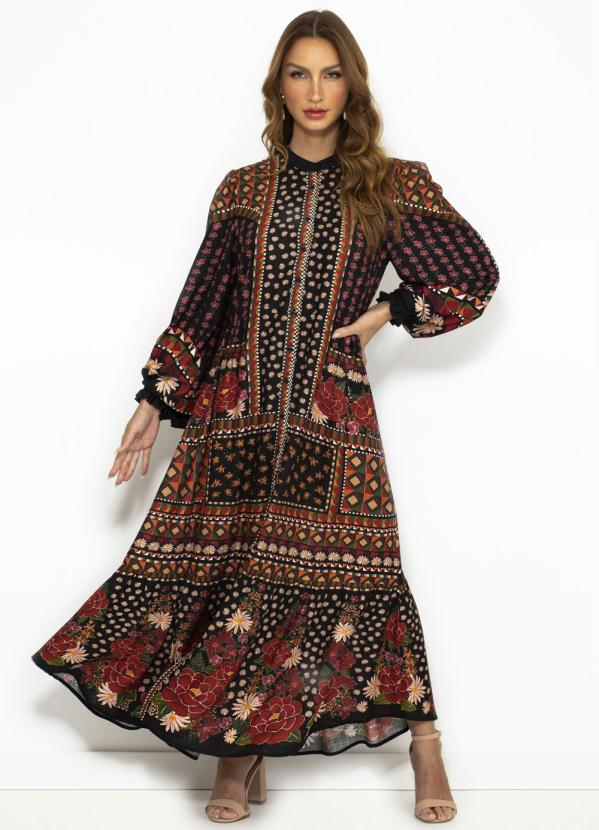 Vestido confeccionado em viscose, modelagem ampla e comprimento midi com babado na barra. A peça possui mangas amplas com elástico no punho, gola padre e fechamento por botões.