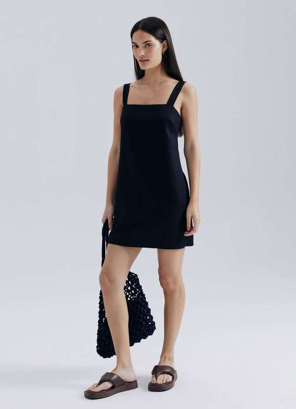 Vestido curto em viscose creponada com toque macio. Possui decote frente e costas reto, alças largas com elástico, zíper nas costas para ajuste e barra larga. Detalhes da peça: Em viscose Modelagem reta Comprimento curto Alças largas Decote reto Zíper nas costas