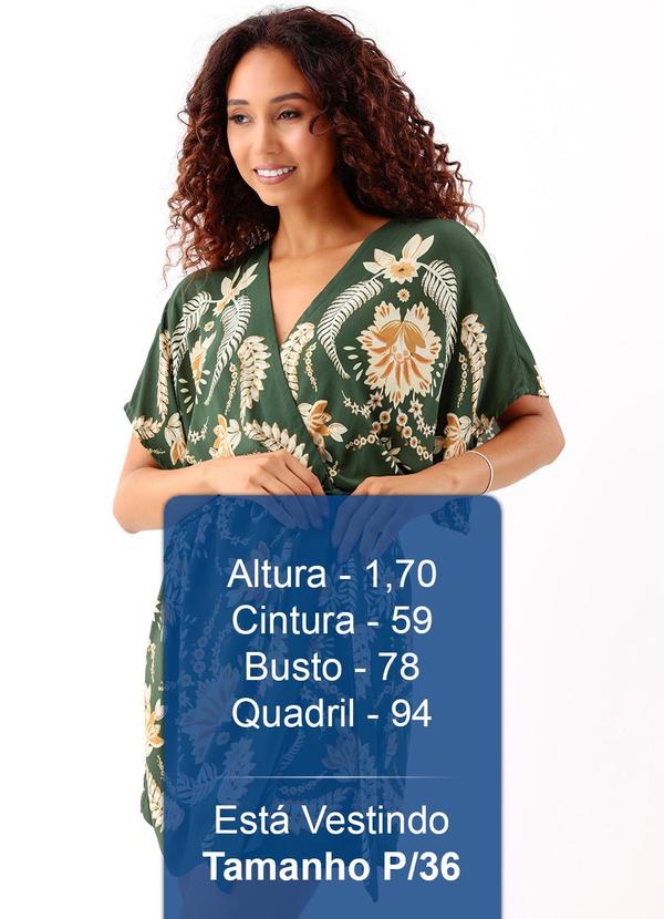 Vestido feminino curto em tecido leve e fluido, com estampa floral em tom verde oliva. Possui decote transpassado em V, mangas amplas que garantem conforto e caimento solto. Acompanha faixa para amarração na cintura, valorizando a silhueta. Ideal para looks frescos, elegantes e versáteis.