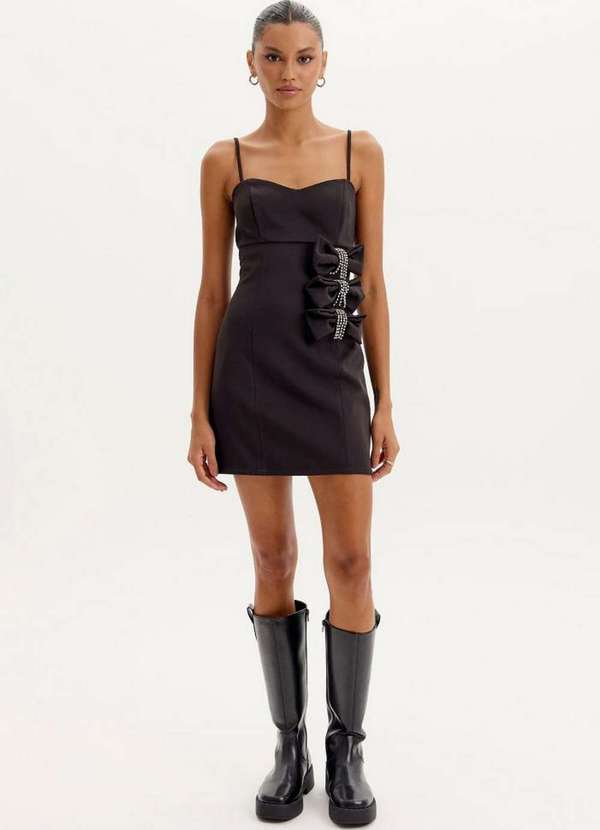 Delicado e sofisticado, o vestido curto é a escolha perfeita para arrasar com muito estilo. A peça possui alças, laços com detalhes de brilho e fechamento por zíper. Combine com salto fino para um visual romântico ou com botas para um look super cool.