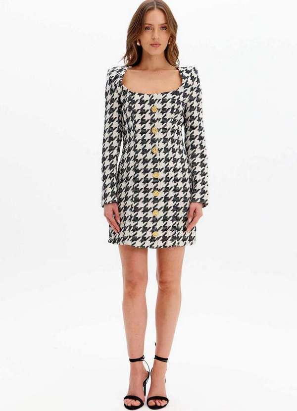 O vestido curto estampado é uma peça versátil e cheia de estilo. apresenta shape justo, decote quadrado e mangas longas com ombreiras. O acabamento em botões é outro destaque.