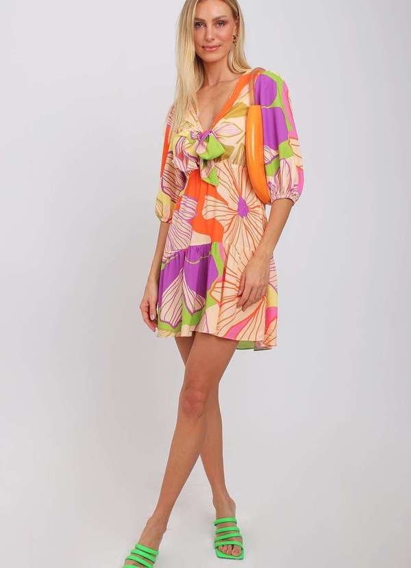 Vestido estampado Pequiá. Possui mangas longas bufantes com elástico fino nos punhos e decote v com amarração. A saia possui elástico fino marcando a cintura e babado largo finalizando o barrado. Composição: 100%Viscose Medidas aproximadas do produto: Tamanho PP : Busto: 83 cm; Cintura: 60 cm; Quadril: 104 cm; Decote: 31,5 cm; Manga: 41 cm; Comprimento:88 cm. Tamanho P : Busto: 87 cm; Cintura: 64 cm; Quadril: 108 cm; Decote: 32 cm; Manga: 42 cm; Comprimento: 90 cm. Tamanho M : Busto: 91 cm; Cintura: 68 cm; Quadril: 112 cm; Decote: 32,5 cm; Manga: 43 cm; Comprimento: 92 cm. Tamanho G : Busto: 95 cm; Cintura: 72 cm; Quadril: 116 cm; Decote: 33 cm; Manga: 44 cm; Comprimento: 94 cm. Tamanho GG : Busto: 99 cm; Cintura: 76 cm; Quadril: 120 cm; Decote: 33,5 cm; Manga: 45 cm; Comprimento: 96 cm. MEDIDAS MODELO: Amália Wust - Altura 1,80m, Busto 86cm, Cintura 67cm, Quadril 91cm - Tamanho 38/ P.