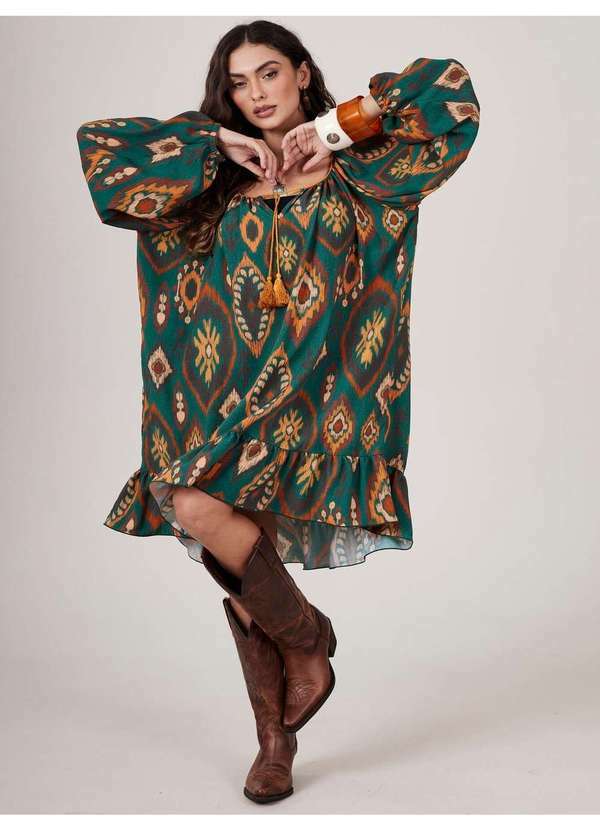 O Vestido Curto Ombro a Ombro Verde Escuro Yacamim é a escolha perfeita para quem ama unir feminilidade, conforto e estilo em uma única peça. Seu decote ombro a ombro com cordão de pompons traz um charme artesanal irresistível, enquanto as mangas longas bufantes e o babado na barra garantem um visual romântico e contemporâneo.Confeccionado em 100% Viscose, o vestido possui um toque leve, macio e um caimento fluido, ideal para os dias mais quentes ou ocasiões descontraídas. A estampa exclusiva em verde escuro valoriza ainda mais a sofisticação da peça. E para completar, ele acompanha um saquinho de transporte na mesma estampa ¿ perfeito para levar em viagens ou guardar com carinho. Produzido com excelência pela marca Yacamim, 100% nacional, o vestido reflete autenticidade e qualidade em cada detalhe. Lembramos que os acessórios utilizados nas fotos não acompanham o produto. Em razão da iluminação e outros fatores externos, o produto pode apresentar pequenas variações de tonalidade em relação às imagens exibidas no site. Composição: 100% Viscose.Detalhes Importantes: Confeccionado pela marca Yacamim, 100% nacional; Acompanha saquinho de transporte na mesma estampa da peça; Acessórios não acompanham o produto anunciado; Pode apresentar variações de tonalidade em relação às fotos do site.Instruções de Lavagem: Lavar à mão ou na máquina, utilizando ciclo suave Não utilizar cloro ou derivados Secar à sombra Passar a ferro em temperatura baixa Não lavar a seco Medidas da Modelo: Altura: 1,71m Busto: 85 cm Cintura: 60 cm Quadril: 90 cm.