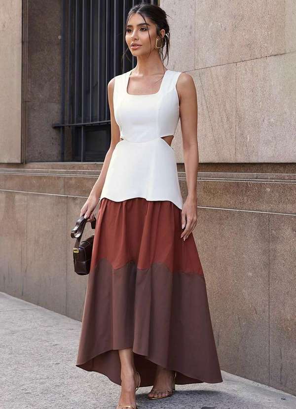 Dot Clothing - Vestido Dot Clothing Midi Mulet Tricolor Marrom