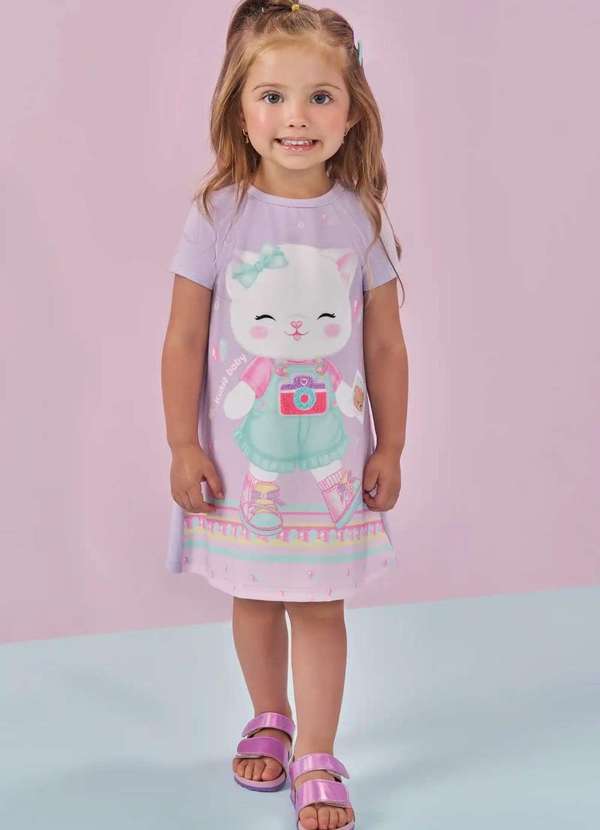 O vestido em cotton, prepara as meninas para o verão com muito estilo e conforto! Disponível em uma cor super estilosa - lilás - este vestido é perfeito para os dias quentes e cheios de aventura, garantindo a combinação perfeita de delicadeza e conforto! A sublimação divertida e o patch termocolado, adicionam um charme especial à peça. Composição: VESTIDO : /COSTAS/MANGA:97% ALGODÃO, 3% ELASTANO, /FRENTE:92% POLIÉSTER, 8% ELASTANO