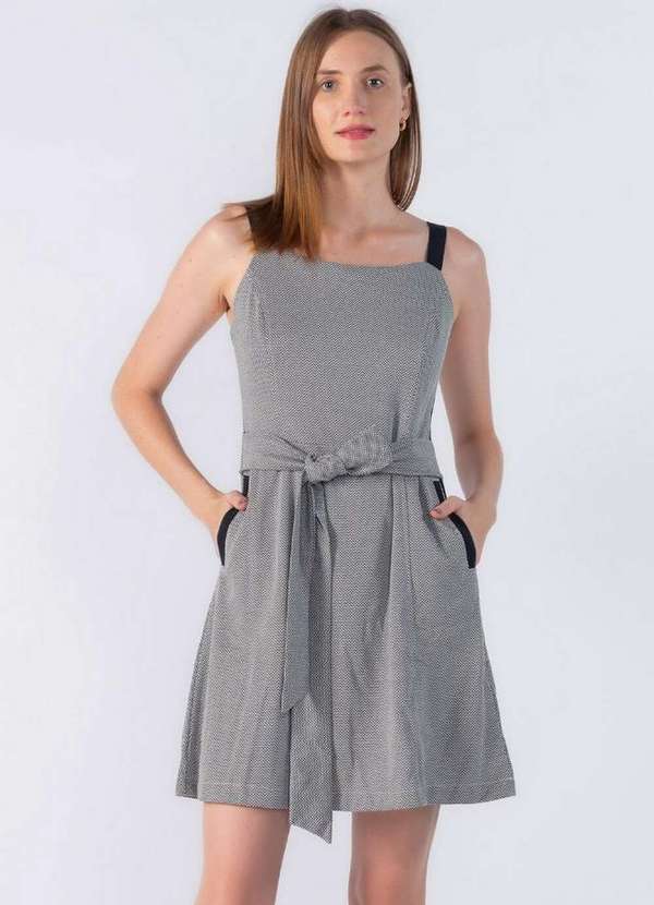 Vestido curto com alças reguláveis e amarração na cintura e bolsos Dica: Usar com scarpin ou tênis branco Composição:83%poliester 13%viscose 04%elastano /Forro: 100% poliéster Modelo usa: Tamanho P - Medidas 1,78 de altura | 55kg.