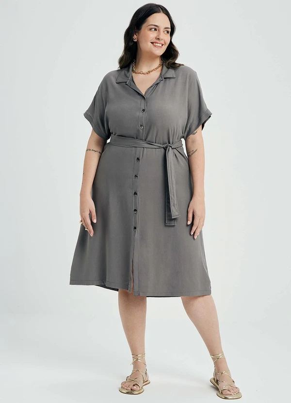 Marialícia - Vestido Feminino Midi Chemise com Faixa Cinza