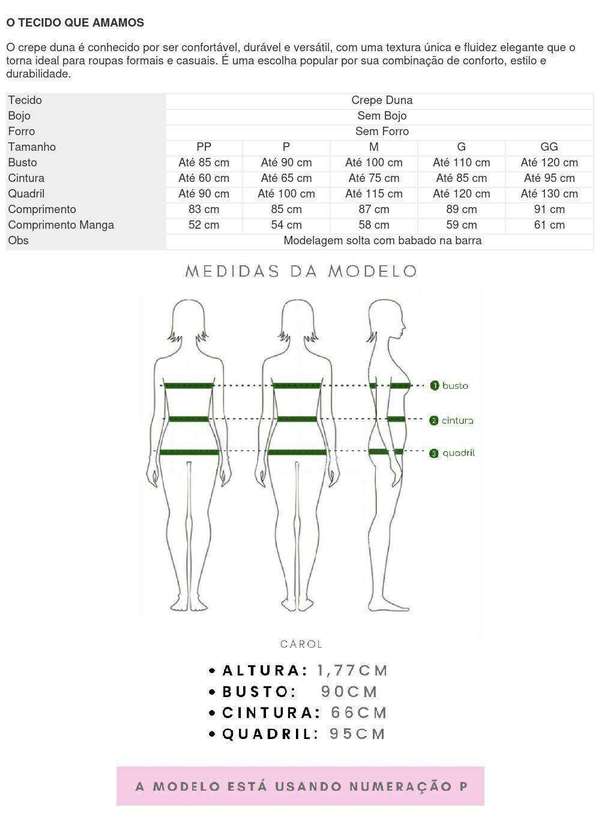 O TECIDO QUE AMAMOS O crepe duna é conhecido por ser confortável, durável e versátil, com uma textura única e fluidez elegante que o torna ideal para roupas formais e casuais. É uma escolha popular por sua combinação de conforto, estilo e durabilidade. Tecido Crepe Duna Bojo Sem Bojo Forro Sem Forro Tamanho PP P M G GG Busto Até 85 cm Até 90 cm Até 100 cm Até 110 cm Até 120 cm Cintura Até 60 cm Até 65 cm Até 75 cm Até 85 cm Até 95 cm Quadril Até 90 cm Até 100 cm Até 115 cm Até 120 cm Até 130 cm Comprimento 83 cm 85 cm 87 cm 89 cm 91 cm Comprimento Manga 52 cm 54 cm 58 cm 59 cm 61 cm Obs Modelagem solta com babado na barra