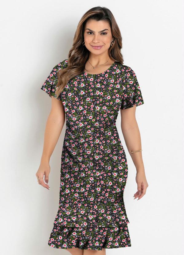 Rosalie - Vestido Justo Floral Preto Moda Evangélica