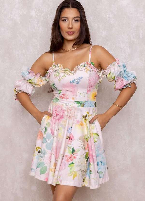 Vestido Limone rodado decote ciganinha Estampado Rosa 03-3572