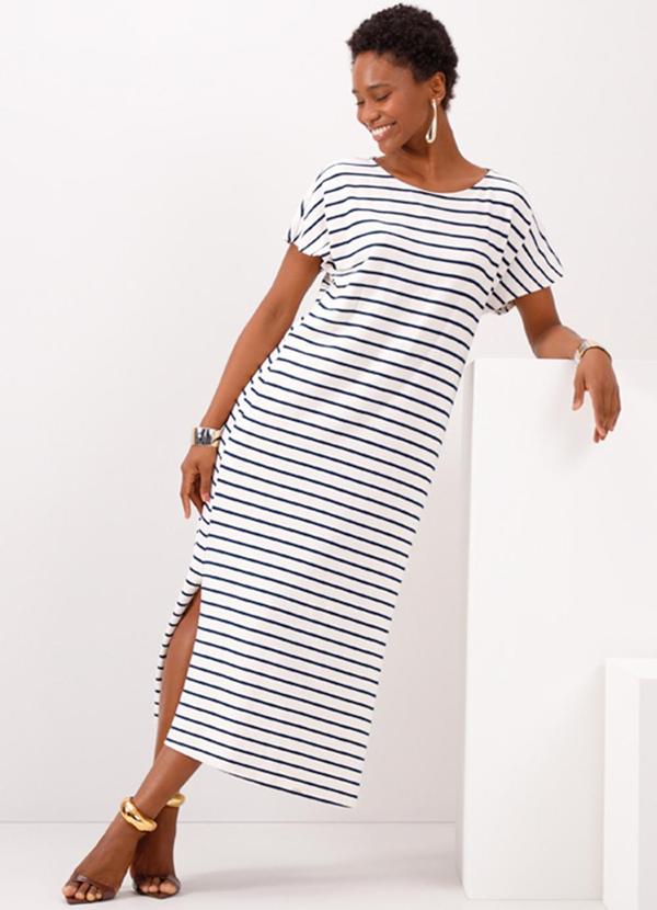 Lunender - Vestido Listrado Midi com Fendas Laterais Azul