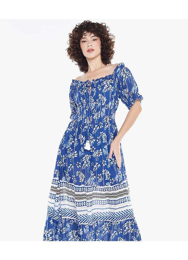 Cor: aAzul Marinho Detalhes: Vestido longo rodado 3 marias com mangas curtas. Decote ombro a ombro com elástico macio interno, com acabamento em fita do mesmo tecido, e pingente em chuveiro. Mangas curtas com barra franzida com lastex. Cintura com faixa larga de lastéx. Saia longo rodada, com 3 recortes estilo maria e babado na ponta. Tecido estampado, com detalhe em listras de lurex dourado.Forrado no corpo e na saia até altura da coxa. Comprimento: Longo. Modelagem: Regular (tamanho M equivalente a 38/40). Composição:100% Algodão, forro em cambraia de algodão. Detalhes metalizados. Instrução de lavagem: Lavar à mão. Transparência/Forro: Com forro até altura da coxa. Modelo com 170 cm de altura, busto 82 cm, cintura 60 cm, quadril 96 cm. vestido longo, vestido boho, vestido estampado, vestido com lastéx, vestido em algodão, vestido longo estampado, vestido longo com lastéx, vestido diferente, vestido romântico, vestido longo com mangas curtas, vestido longo com lurex ..