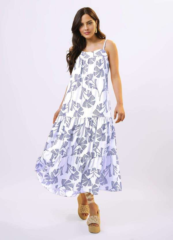 MODELAGEM GRANDE P= 38/40, EDIÇÃO LIMITADA Cor: Off White e Azul médio. Detalhes: Vestido longo de linho estampado em branco e azul. Alças finas com regulador dourado. Bolsos laterais na altura do quadril, verdadeiros. Pequena faixa de lastéx nas costas para melhor caimento do busto. Recortes estilo maria na saia, com franzido. Tecido peso médio, macio, sem forro, sem transparência. Comprimento: Longo. Composição:30% linho 70% viscose. Instrução de lavagem: Lavar à mão, não colocar na secadora. Transparência/Forro: Sem forro. vestido de linho longo, vestido longo, vestido solto com bolsos, vestido para trabalhar, vestido de verão, vestido fresco, vestido liso, look elegante, look ease-chic, vestido simples, vestido prático, look de trabalho..