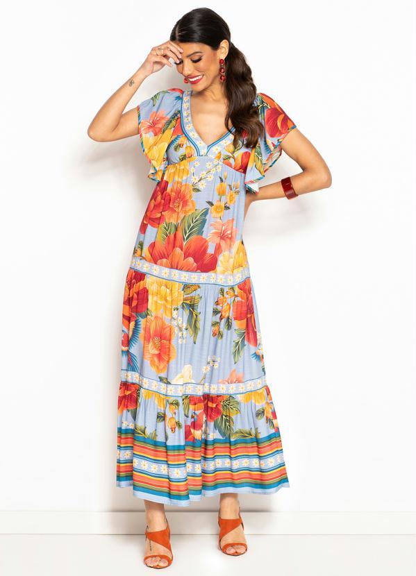 Farm - Vestido Longo de Viscose Bela Chita Azul