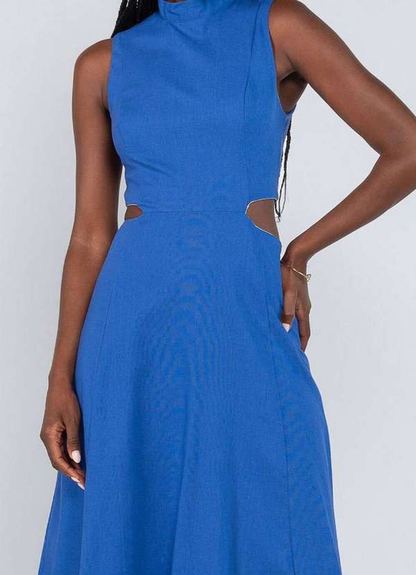 Lamis - Vestido Longo em Linho com Recortes Cintura Azul