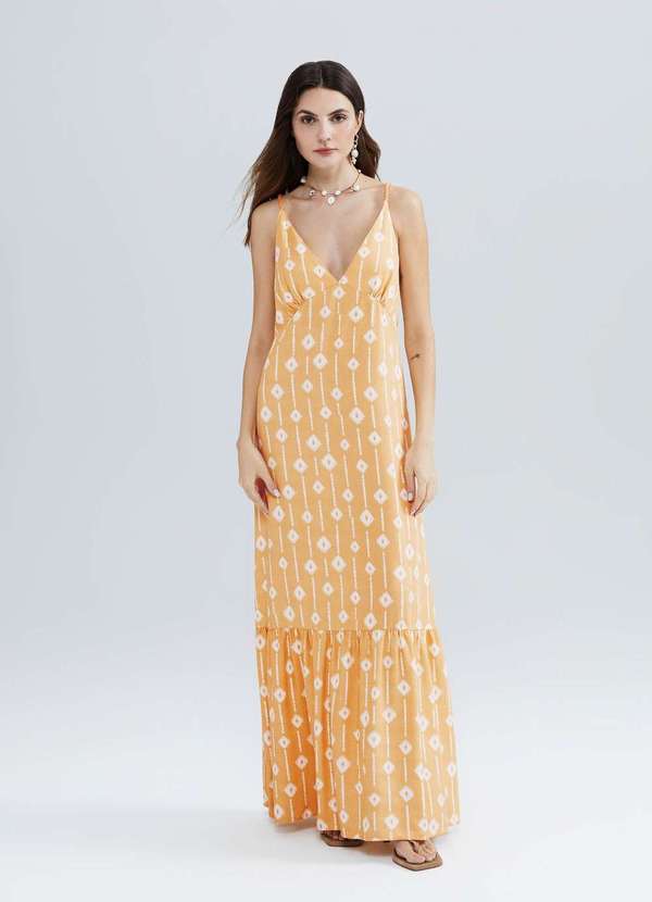 Vestido longo elaborado em tecido de viscose com estampa vibrante. Os franzidos na barra acrescentam um toque de sofisticação e movimento. Detalhes da peça: Em tecido Modelagem evasê Comprimento longo Decote V Alças finas Amarração costas Franzidos na barra