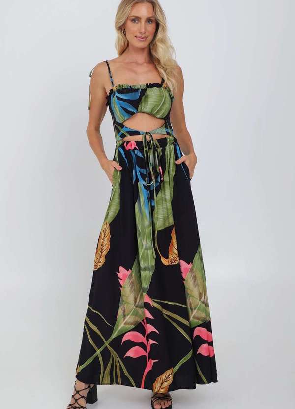 Vestido longo Pequiá. Vestido longo Pequiá. Possui decote reto com babadinhos acompanhando todo o decote, alças finas com ajuste por amarração nos ombros e lastex aplicado nas costas. A peça possui recorte vazado na parte frontal da cintura com amarração, saia com cós de elástico e modelagem ampla e barrado finalizado com bainha fina. O modelinho possui linda estampa exclusiva e tecido leve e soltinho em viscose.. Composição: 100%Viscose *as peças podem variar a estampa de acordo com o corte. *a tonalidade das cores pode varias de acordo com a sua tela/monitor. *acessórios não acompanham. MEDIDAS MODELO: Amália Wust - Altura 1,80m, Busto 86cm, Cintura 67cm, Quadril 91cm - Tamanho 38/ P. Medidas aproximadas do produto: PP: Busto:71cm, Cintura: 60cm, Quadril: 99cm, Comprimento: 128cm. P: Busto: 75cm, Cintura: 64cm, Quadril: 103cm, Comprimento: 129cm. M: Busto: 79cm, Cintura: 68cm, Quadril: 107cm, Comprimento: 130cm. G: Busto:83cm, Cintura:72cm, Quadril: 111cm, Comprimento: 131cm. GG: Busto: 87cm, Cintura: 76cm, Quadril: 112 cm, Comprimento: 132cm.
