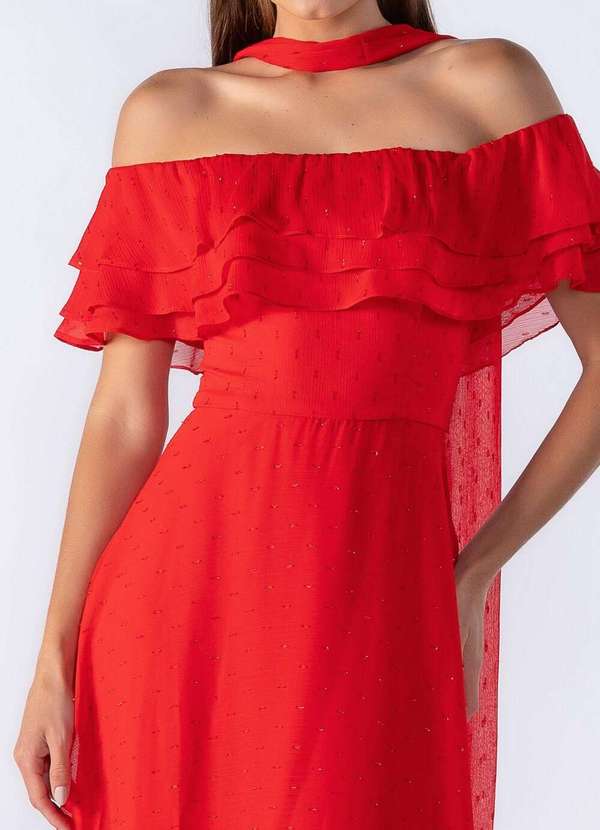 Vestido longo com decote ombro a ombro com babados e detalhe em lurex Dica: Usar com salto e sandálias Composição: 100%poliester |Forro: 100%poliester Modelo usa:Tamanho P - Medidas 1,75 de altura | 62kg.