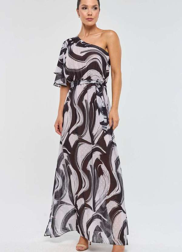 Vestido confeccionado em tecido crepe chiffon estampado com leve textura, excelente caimento, fluidez e toque macio. Peça possui modelagem solta, shape reto, estampa preto e branco, decote um ombro só, manga curta, elástico na cintura para melhor ajuste, fechamento por zíper lateral, forro interno, fenda nas laterais, comprimento longo e acabamento pespontado. Acompanha cinto faixa do mesmo tecido para amarração. Celebre momentos especiais com sofisticação usando este vestido longo preto e branco de um ombro só, ideal para mulheres que apreciam estilo refinado e presença marcante. Com design assimétrico que valoriza o colo e tecido leve que garante conforto e movimento, essa peça é perfeita para ocasiões que pedem elegância e personalidade. Seja em jantares elegantes, formaturas, casamentos ou eventos especiais, este vestido é a escolha certa para quem deseja se destacar com charme e confiança.