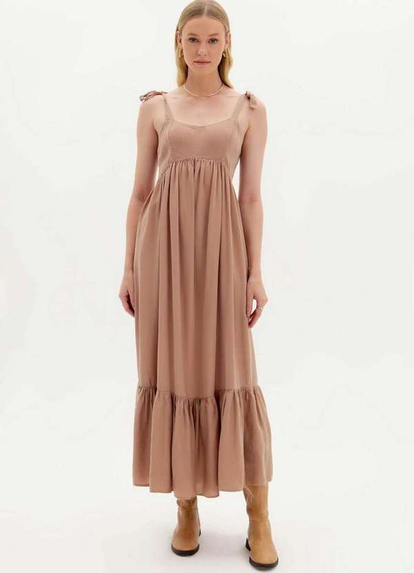 Delicadeza e elegância definem o vestido de sarja. Com seu comprimento longo super sofisticado, ele se adapta a diferentes ocasiões. O caimento fluido proporciona conforto absoluto. E o detalhe da amarração nas alças traz um toque romântico e ao look.