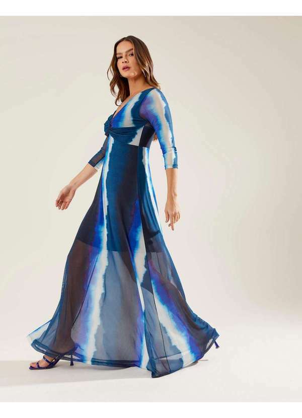 Zinzane - Vestido Longo Tule Estampado Suzi - Azul Marinho Azul