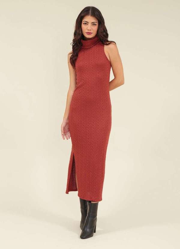 Pop Me - Vestido Malha Tricot Gola Alta sem Manga Marrom