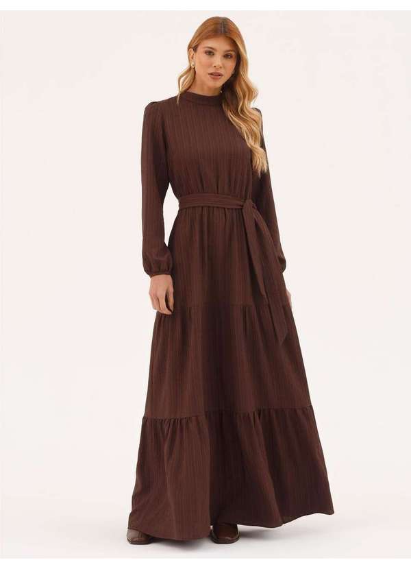 Principessa - Vestido Manga Longa em Crepe Texturizado Marrom Esilda