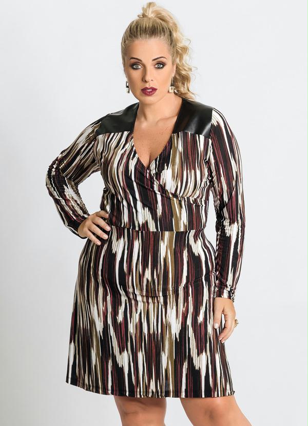 Vestido Manga Longa Estampa Abstrata Plus Size, confeccionada em liganete com elastano.