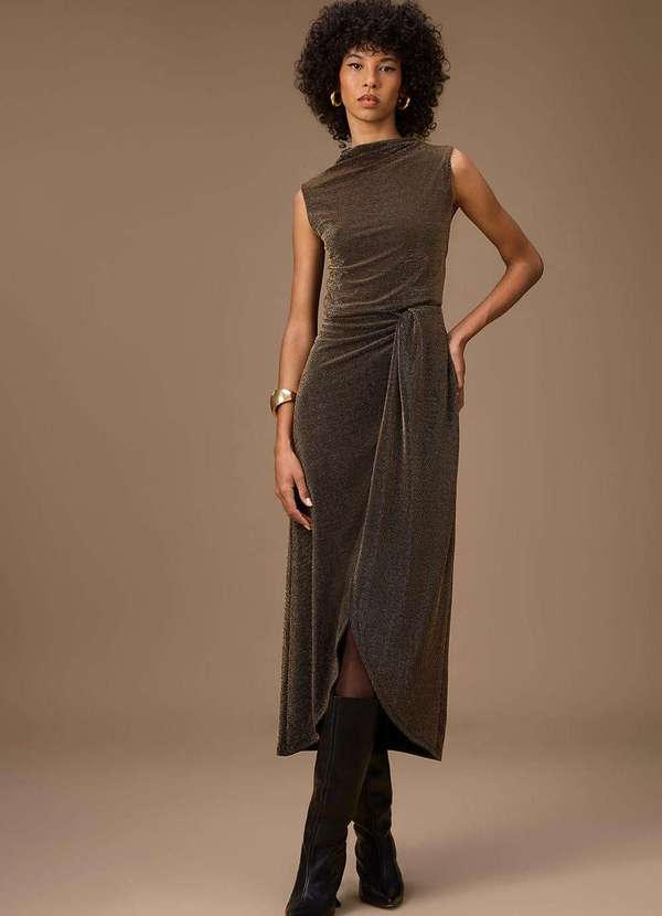 Maria.valentina - Vestido Maria.Valentina Ajustado Gola Alta sem Manga Midi Dourado Dourado