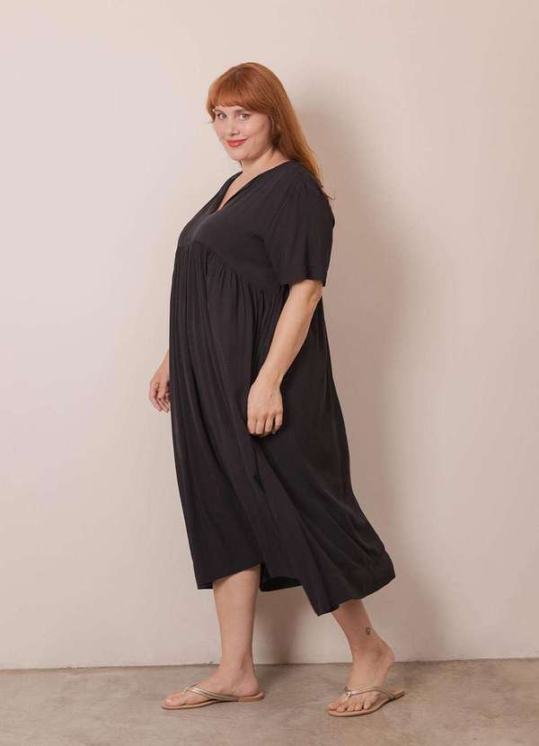 Vestido plus size em viscose. Modelagem evasê. Decote V. Comprimento Midi. Bolsos nas laterais. Recorte no busto com franzidos. Observação: Essa peça passou por processo de lavagem e não sofrerá encolhimento. Sugerimos lavar essa peça em água fria e à mão. Se optar pela máquina, use o modo delicado. Isso irá garantir bons resultados finais e uma maior durabilidade da sua peça. Não usar secadora. Não aceitamos devoluções de peças usadas.
