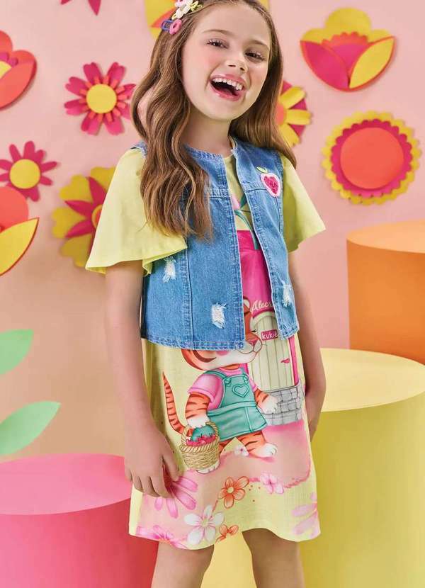 Vestido Menina Manga Curta Colete Estampado Kukiê. Conforto, estilo e fofura em cada detalhe! Essa peça infantil foi feita pensando no dia a dia dos pequenos: leve, macia e com caimento ideal para garantir liberdade de movimento em qualquer aventura. O tecido é de alta qualidade, com toque suave e acabamento impecável, ideal para brincadeiras, passeios ou aquele momento especial em família. Design moderno e cheio de charme, para deixar seu pequeno ainda mais estiloso!
