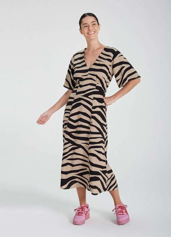 Vestido Midi Evasê Com Estampa Animal Print. Confeccionado em tecido plano de viscose que proporciona caimento leve e toque suave. Possui comprimento midi, decote V mais profundo e mangas curtas amplas. Conta com recorte diagonal abaixo do busto com pences, formando uma modelagem acinturada e com ótima vestibilidade. A saia é mais solta do corpo, no shape evasê. O destaque fica por conta da estampa exclusiva animal print que exprime autenticidade Charmoso e super democrático, é um modelo que cai bem em todos os tipos de corpos e combinações. Um curinga que permite combinar tanto com sandália, assim como, com tênis ou bota. Você quem decide!