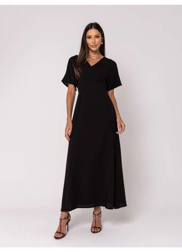 Salvatore Fashion - Vestido Midi Feminino Viscolinho Cinturado Preto