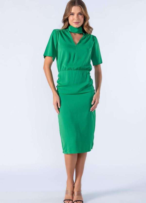 Vestido midi com amarração costas Dica: Usar com scarpin Composição:100% poliéster Modelo usa: Tamanho P - Medidas 1,75 de altura | 62kg.
