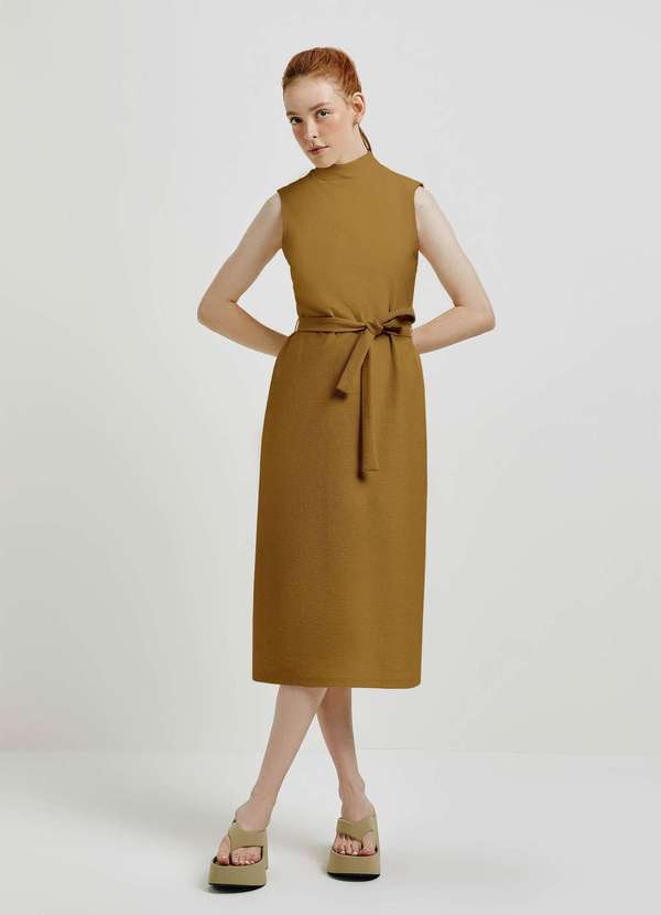 O vestido midi gola alta texturizado com faixa é a peça ideal para você montar um look básico e sofisticado. O modelo midi é atemporal e pode ser usado em praticamente qualquer ocasião. Dicas de Uso: Seu laço removível permite usar soltinho ou com amarração na cintura, realçando a silhueta, você decide! Detalhes da peça: Em malha Comprimento Midi Modelagem reta Gola alta Ombros muscle tee Recorte vertical nas costas Fechamento costas com abertura e botão