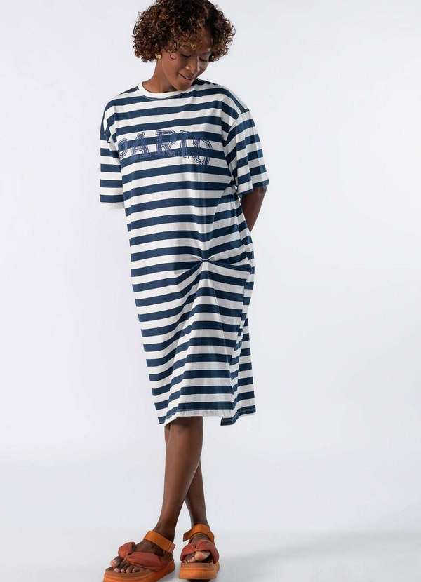 Vestido midi listrado estampa Paris Dica:Usar com tênis e boné Composição:100%algodão | Ribana:96%algodão 04%elastano Modelo usa: Tamanho P - Medidas 1,75 de altura | Peso: 59kg