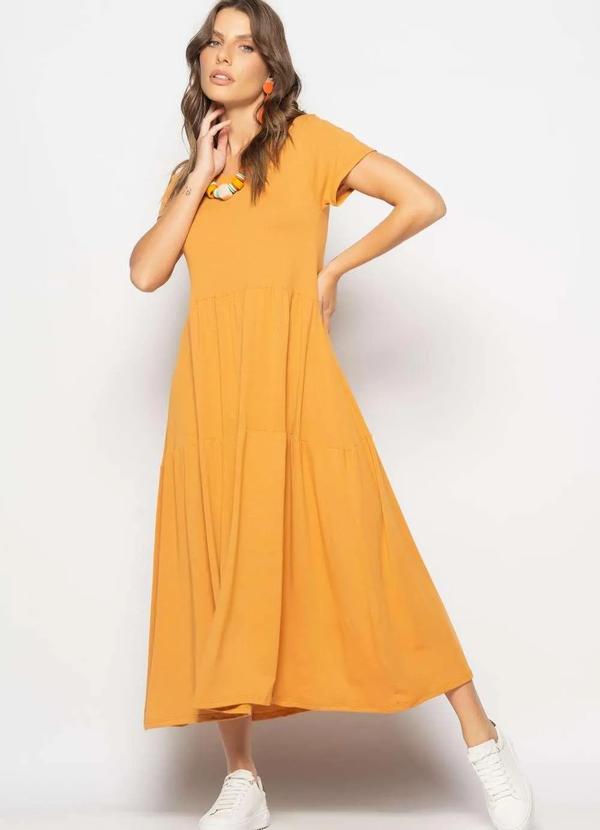 Salvatore Fashion - Vestido Midi Manga Curta com Babado Marrom