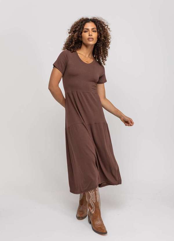 Salvatore Fashion - Vestido Midi Manga Curta com Babado Marrom