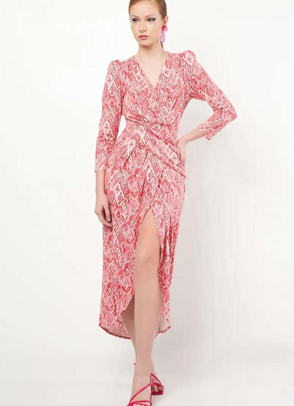 - Modelo Vestido Midi- Decote V transpassado- Manga ¾- Detalhe na cintura com prega- Fenda frontal- Tecido: Jersey (Malha)- Estampa exclusivaComposição: 82% Poliamida 18% Elastano Cor: Vermelho.
